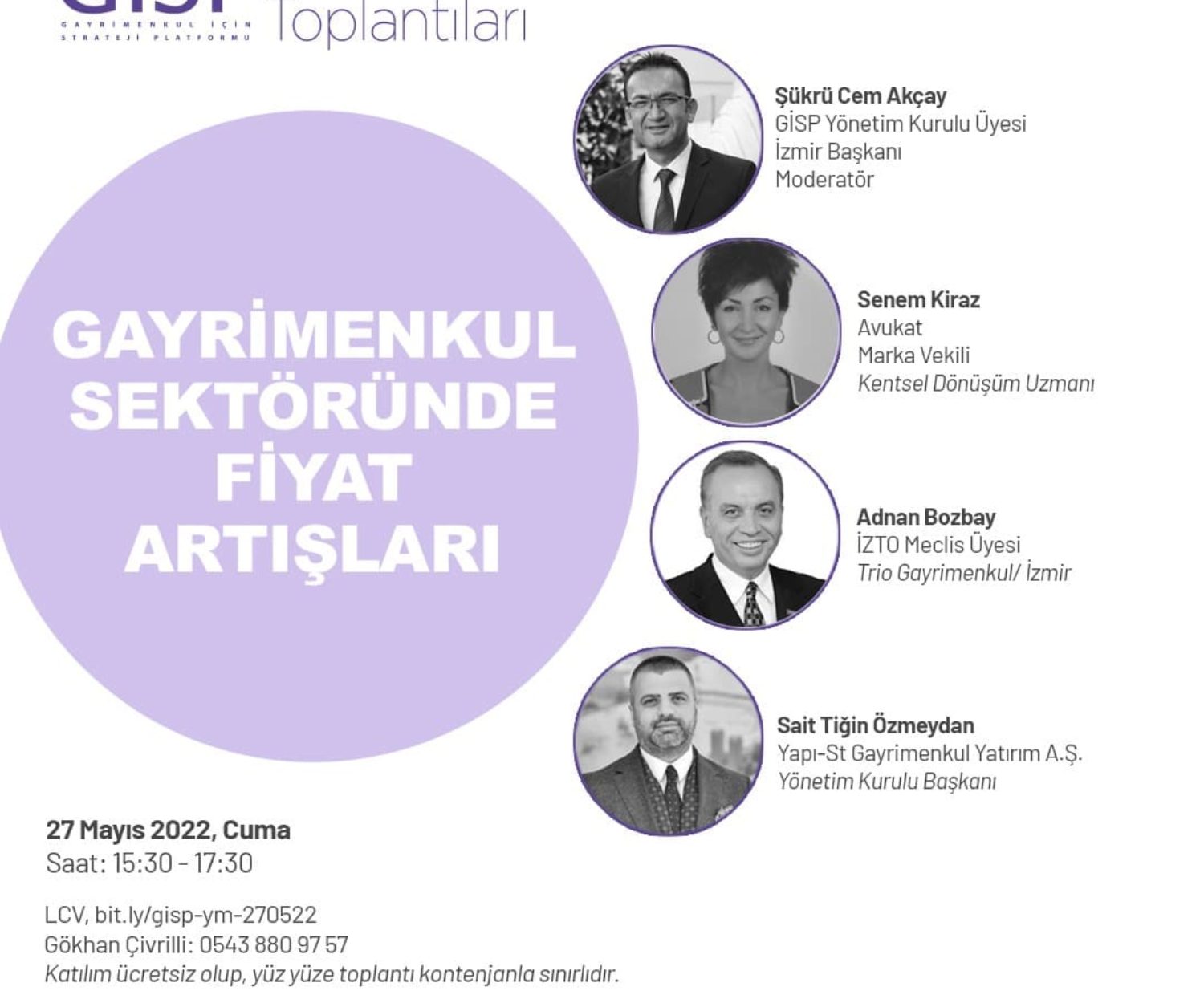 Yuvarlak Masa Toplantıları 04 Tem 2022 Derneğimiz Yönetim Kurulu Üyesi ve İzmir Şube Başkanı Şükrü Cem Akçay tarafından düzenlenen ”Gayrimenkul Sektöründe Fiyat Artışları” konulu Yuvarlak Masa Toplantısı, 27 Mayıs 2022 Cuma günü gerçekleştirilmiştir. Gisp